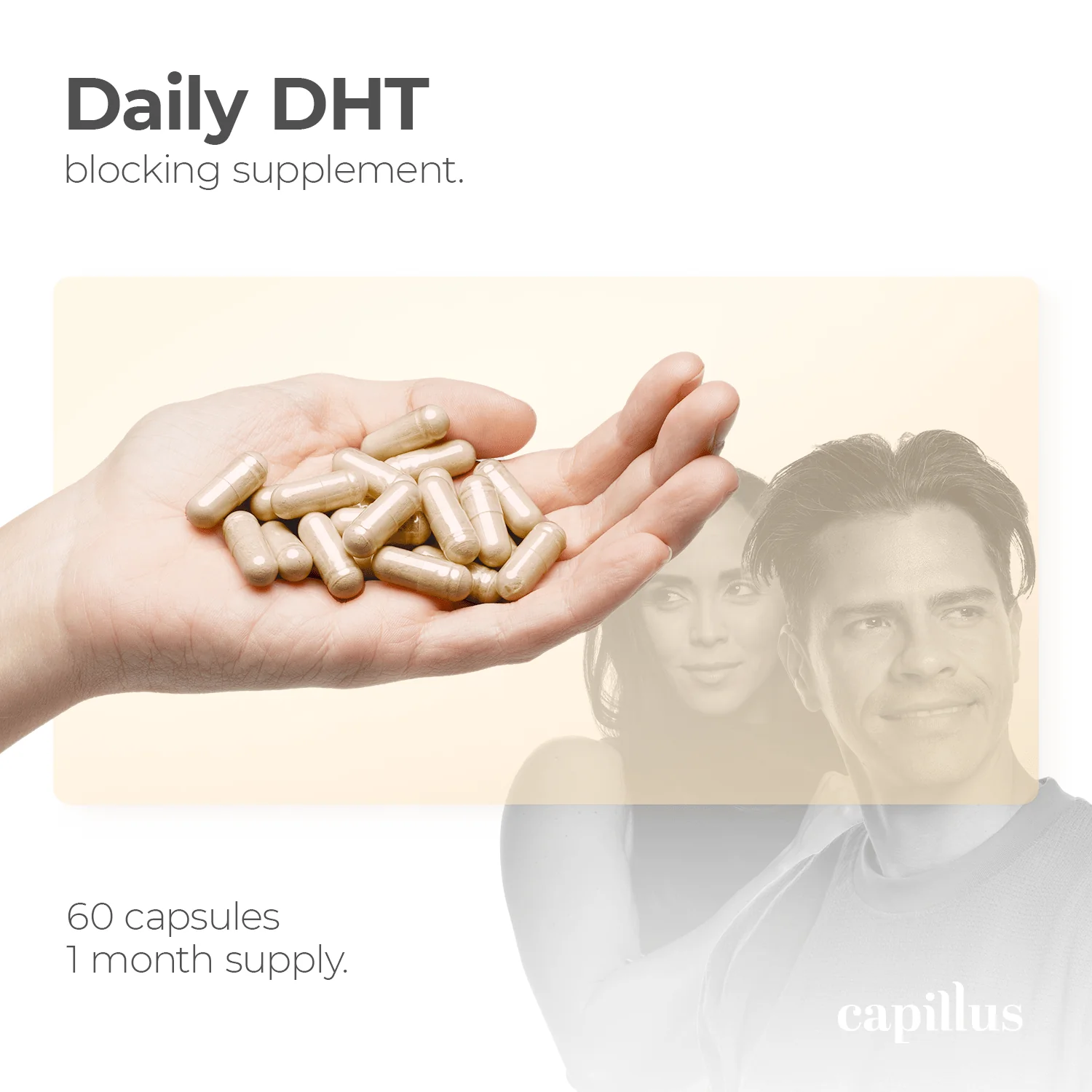 Promotes the blocking of dihydrotestosterone (DHT), which is primarily linked to hair loss, by using all natural ingredients. Capillus DHT Blocker is formulated to help treat androgenetic alopecia in both men and women and to help grow healthier, stronger, and thicker hair.